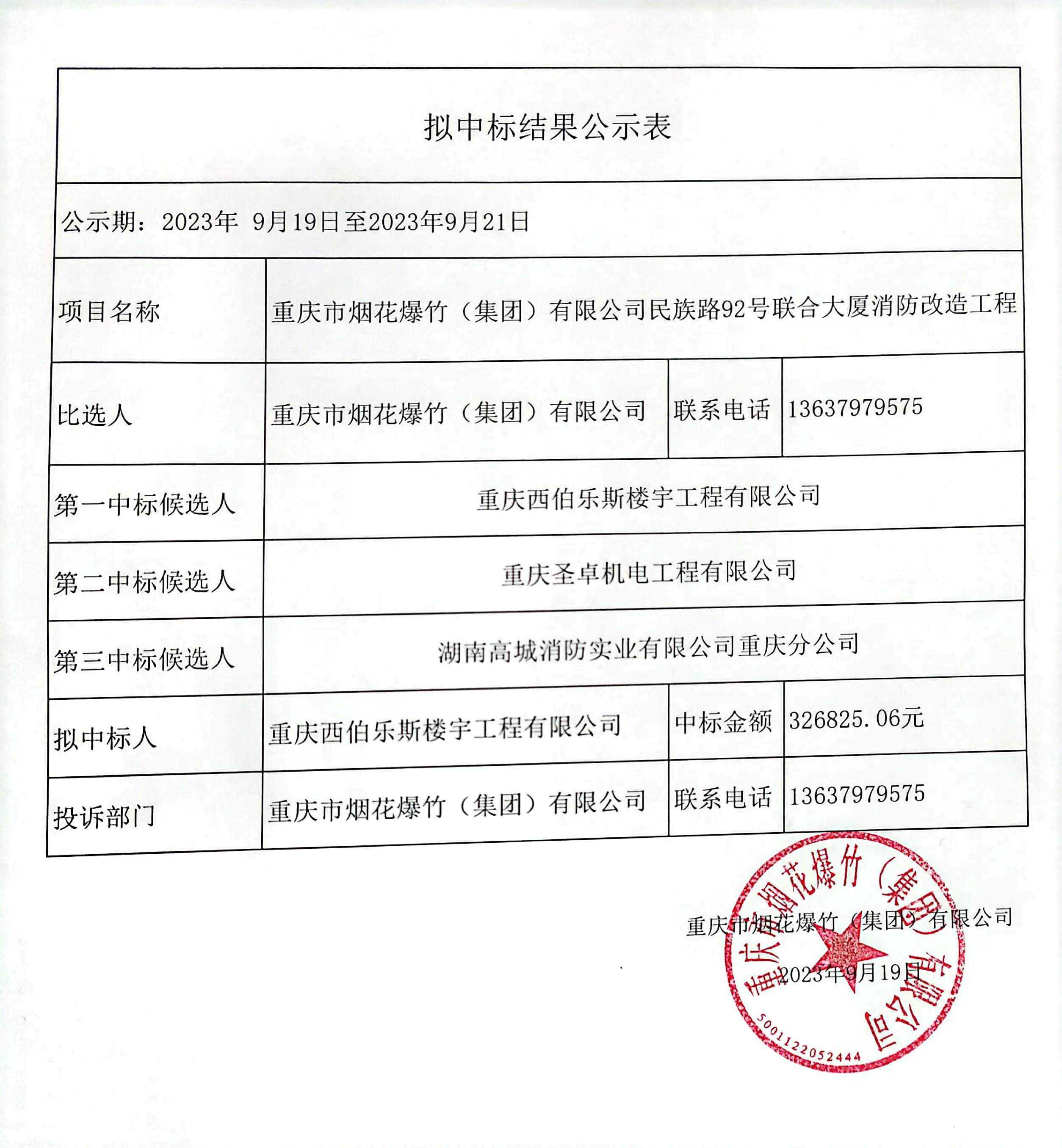 重庆市烟花爆竹(集团)有限公司民族路92号联合大厦消防改造工程拟中标结果公示