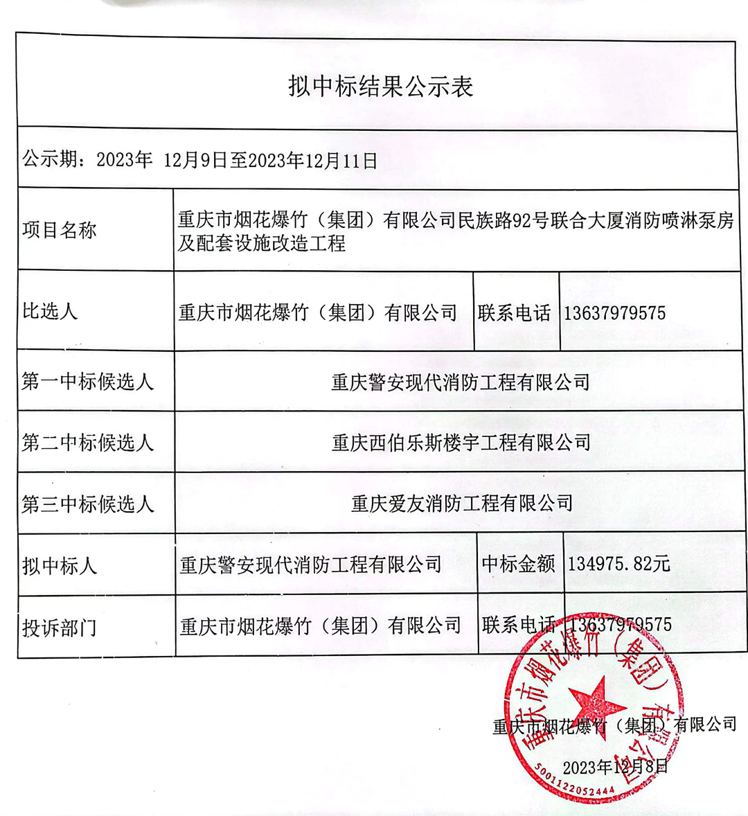 重庆市烟花爆竹(集团)有限公司,民族路92号联合大厦,消防喷淋泵房及配套设施改造工程,拟中标结果公示